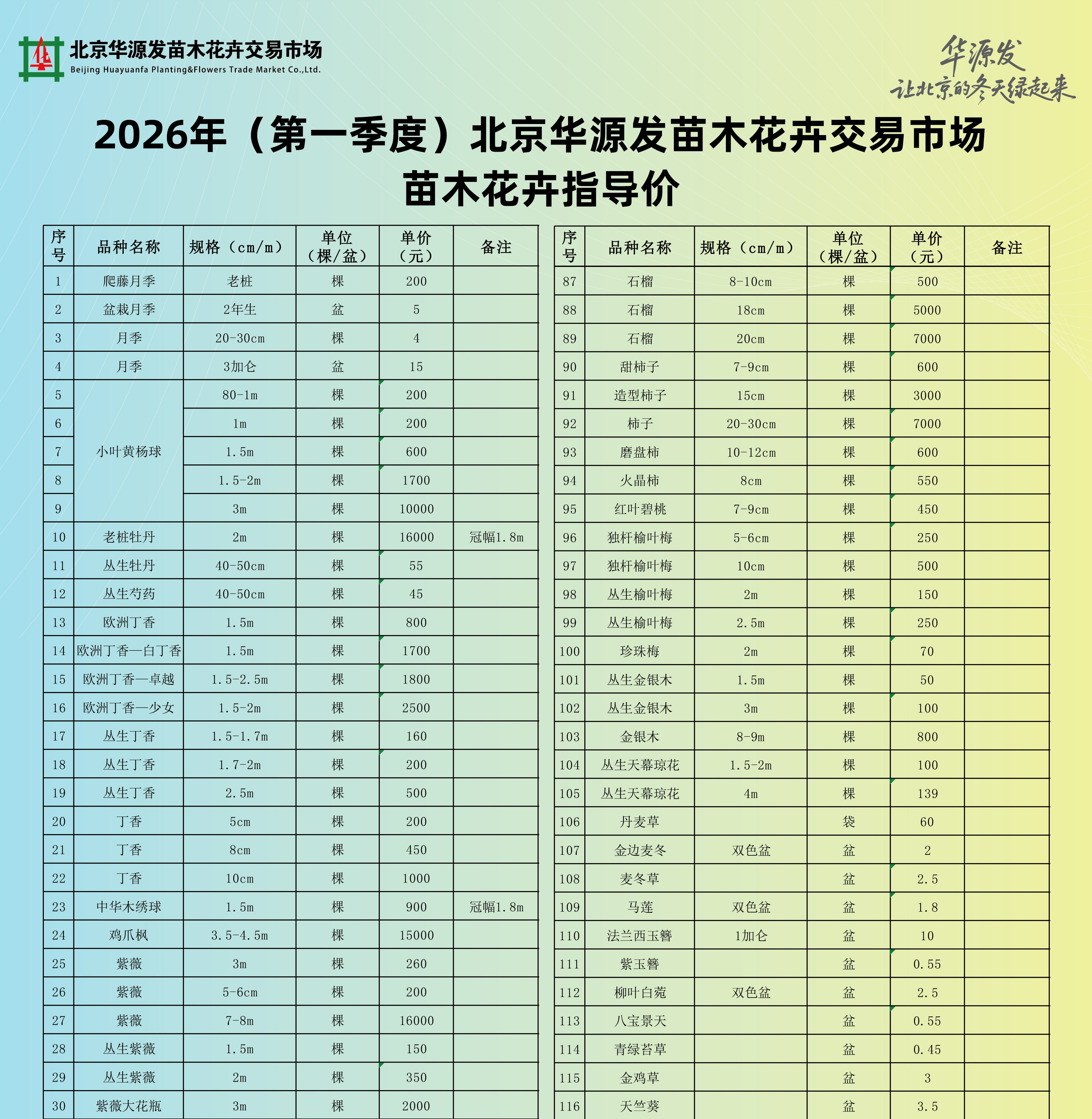 2026年第一季度华源发苗木花卉交易市场价格指导