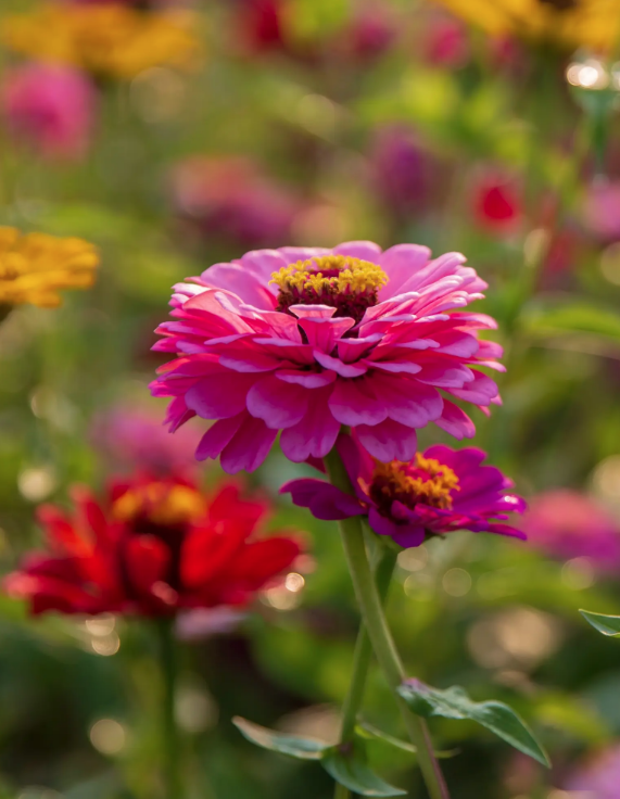百日草也叫百日菊、步步高、火球花、对叶菊等,是一年生草本植物。茎直立,高30-100厘米,被糙毛或长硬毛。叶宽卵圆形或长圆状椭圆形,长5-10厘米,宽2.5-5厘米,基部稍心形抱茎,两面粗糙,下面被密的短糙毛,基出三脉。头状花序,单生枝端,无中空肥厚的花序梗。有单瓣、重瓣、卷叶、皱叶和各种不同颜色的园艺品种。花期6-9月,果期7-10月。
