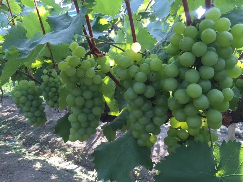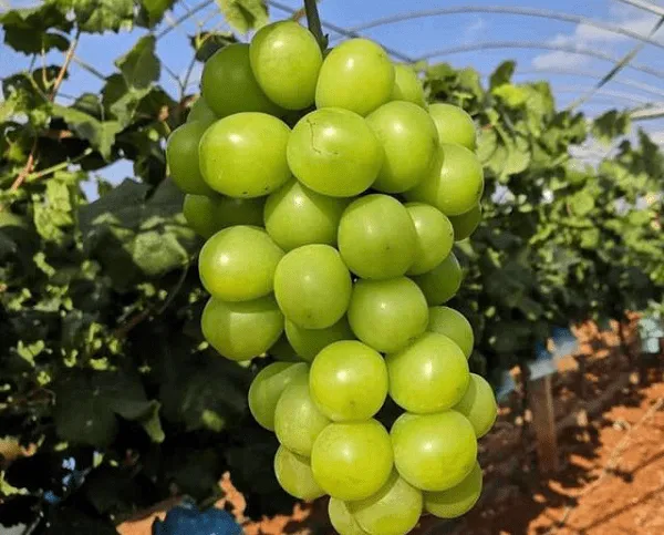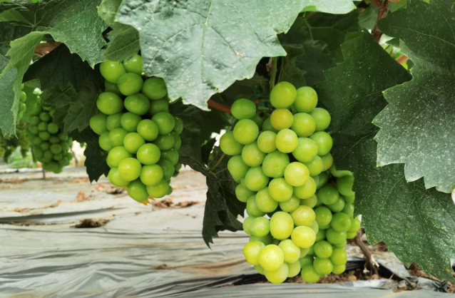阳光玫瑰:欧美种。抗病、大粒、耐贮运、口感好。果穗圆锥形,穗重700克左右,大穗可达2000克左右,平均果粒重10~14克。果粒着生紧密,椭圆形,黄绿色,果面有光泽,果粉少。果肉鲜脆多汁,不裂果,有玫瑰香味,挂树时间极长,即可做中熟又可做晚熟品种,晚采品质好,属高档品种,价格高,该品种不宜高产,需严格控产,随着管理技术的成熟,前景广阔。