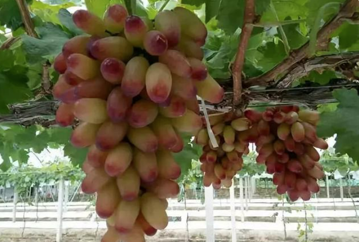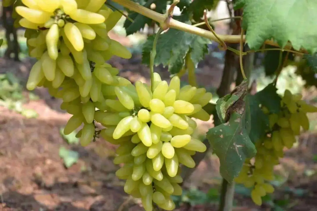 金手指:欧美种,平均穗重750克,大的穗重1500克。果粒形状奇特美观,长椭圆形,略弯曲,呈弓状,黄白色,平均粒重10克,用膨大素处理一次平均粒重13克,不裂果。果肉硬,含糖量21%-26%,有浓郁的牛奶味。耐寒,适合大棚及露天栽培,尤其大棚,产量明显高于露天,特别适合采摘观光园性质的种植,经济效益非常高。