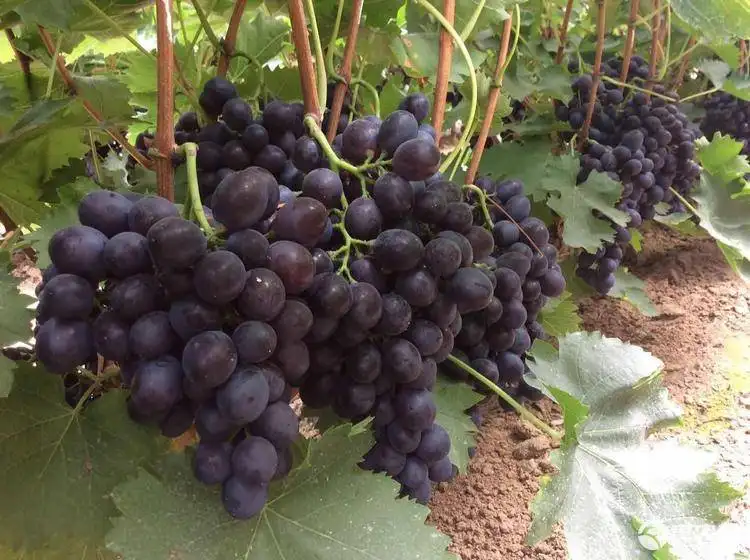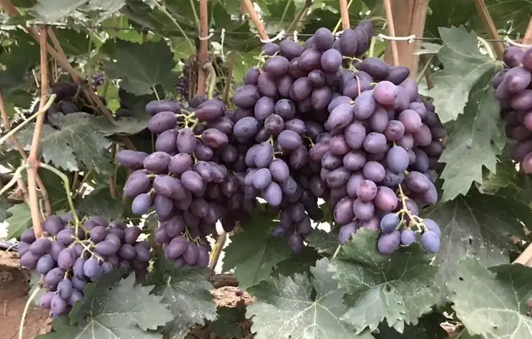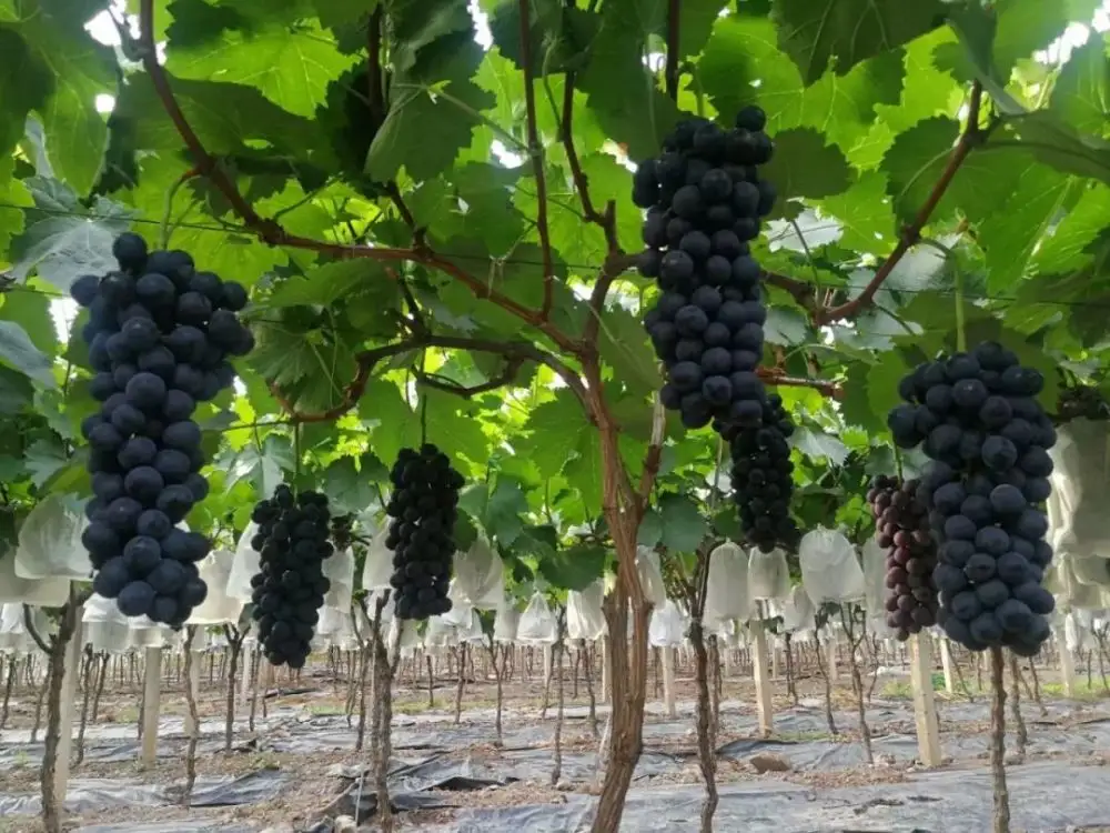夏黑无核:欧美种,早熟无核品种,果穗大,平均穗重700克左右,果粒圆形,经赤霉素处理可达8-10克左右,果皮紫黑色,果实容易上色,成熟一致。浓甜且有草莓香味。适合大棚及露天栽培,该品种虽果粒偏小,但设施栽培控产下质量很好,适合有机栽培。