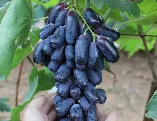 甜蜜蓝宝石:又名月光之泪。外形为蓝黑色,果粉少,即使产生锈斑也能掩盖,高档的外观远超黄绿色品种。果粒圆柱形,长5cm左右,犹如小手指,秀美超常。自然无籽,平均粒重10克左右。属中晚熟品种,露地8~9月成熟,着色快速而均匀。成熟后挂树1个月以上,极耐贮运。