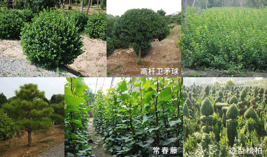 基地常年供应苗木有:华源发黄杨、常春藤、扶芳藤系列、造型桧柏、国槐、法桐、白蜡、栾树、卫矛球、高接卫矛球、造型卫矛系列、造型油松、核桃等。