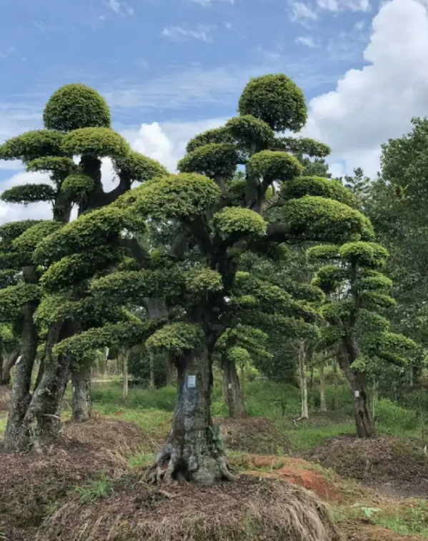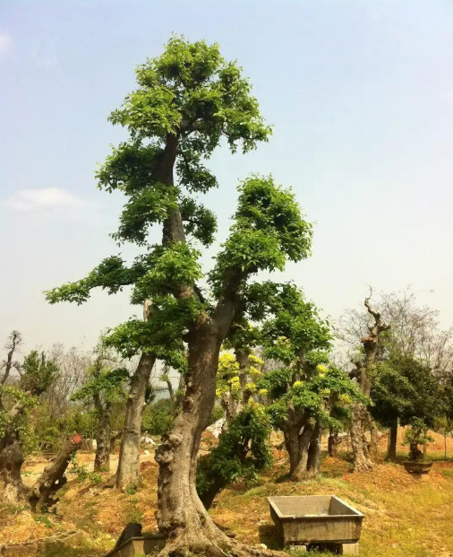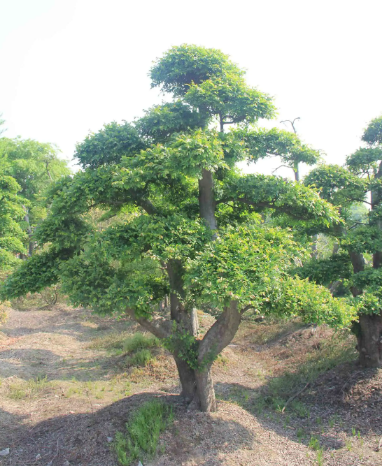 造型榔榆嶙峋多姿,具有山石的地貌形态,萌发的枝条培养成的小树,形成“独木成林”的景观,统一而不失变化,雄浑中又有清秀。