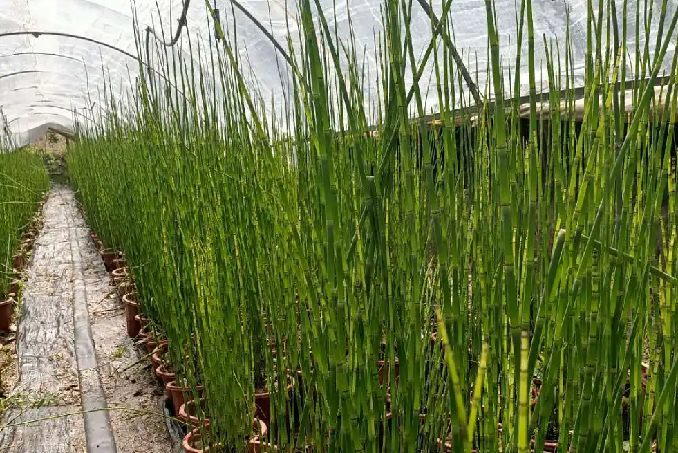 在华源发苗木花卉市场当中的阴湿地方、草丛中生长着一种大型蕨类植物,其特点是叶片退化成鳞片状,没有花、没有果实,看起来丛生的直杆状,有节,这种通常叫木贼或笔头草,具有药用、观赏等价值。