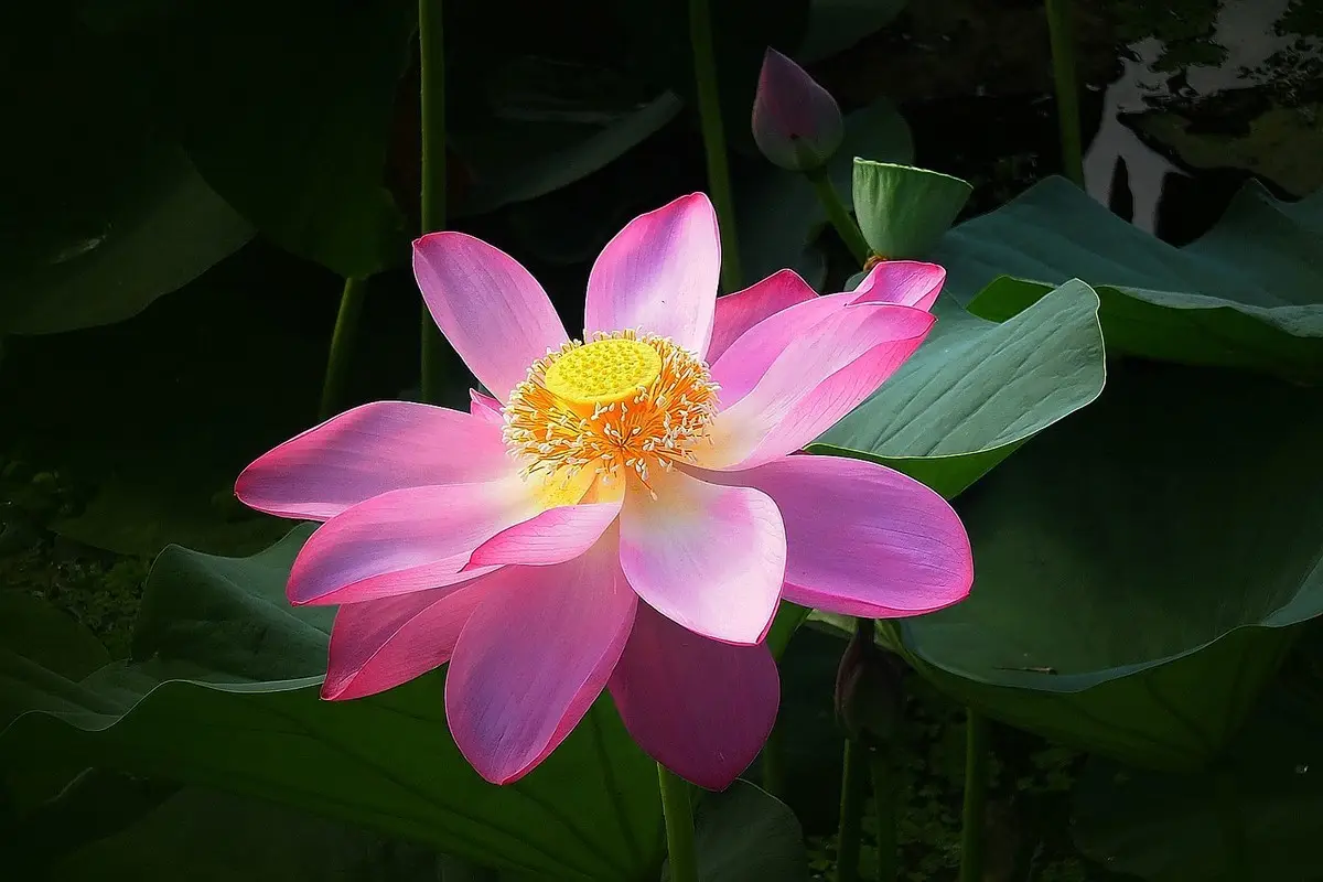 喜相对稳定的平静浅水、湖、沼泽地、池塘,是其适生地。荷花的需水量由其品种而定,大株形品种如古代莲、红千叶相对水位深一些,同时荷花对失水十分敏感。同时,荷花还非常喜光,生育期需要全光照的环境。荷花极不耐荫,在半荫处生长就会表现出强烈的趋光性。